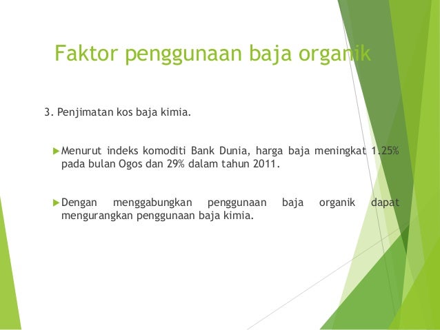 Penggunaan racun serangga pada sayur-sayuran secara berlebihan akan menyebabkan kadar racun serangga dan bahan kimia akan terserap pada sayur-sayuran amat tinggi. 81 Kesan Kegiatan Manusia terhadap Alam Sekitar. Penggunaan baja organik daripada pelbagai sumber adalah amat digalakkan berbanding baja kimia.